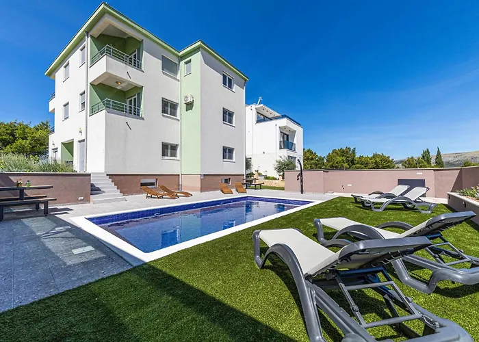 91m^2 Three-Bedroom Apartment In Saldun 트로기르는 최대 8명까지 수용할 수 있습니다. 스플리트 공항은 4.2km 거리에 있으며 트로기르 마리나는 차로 5분 거리에 있습니다.
